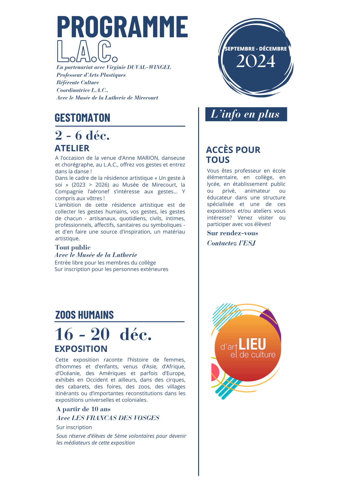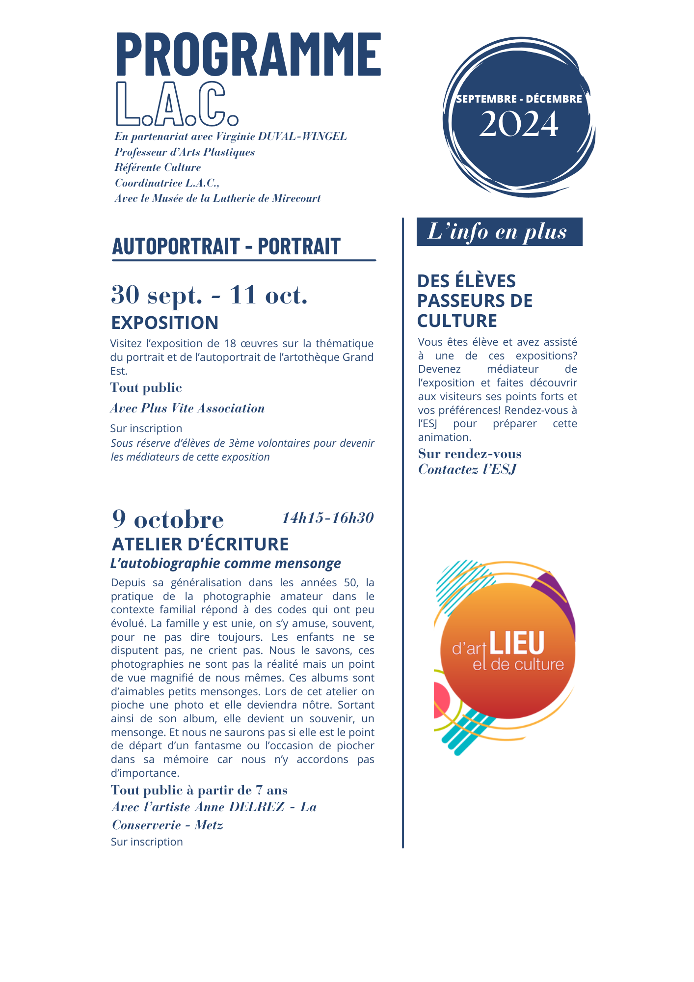 La partie artistique a été élaborée en partenariat avec Virginie DUVAL-WINGEL, professeure d’Arts plastiques au Collège et au Lycée de Mirecourt, Référente Culture et Coordinatrice du L.A.C.