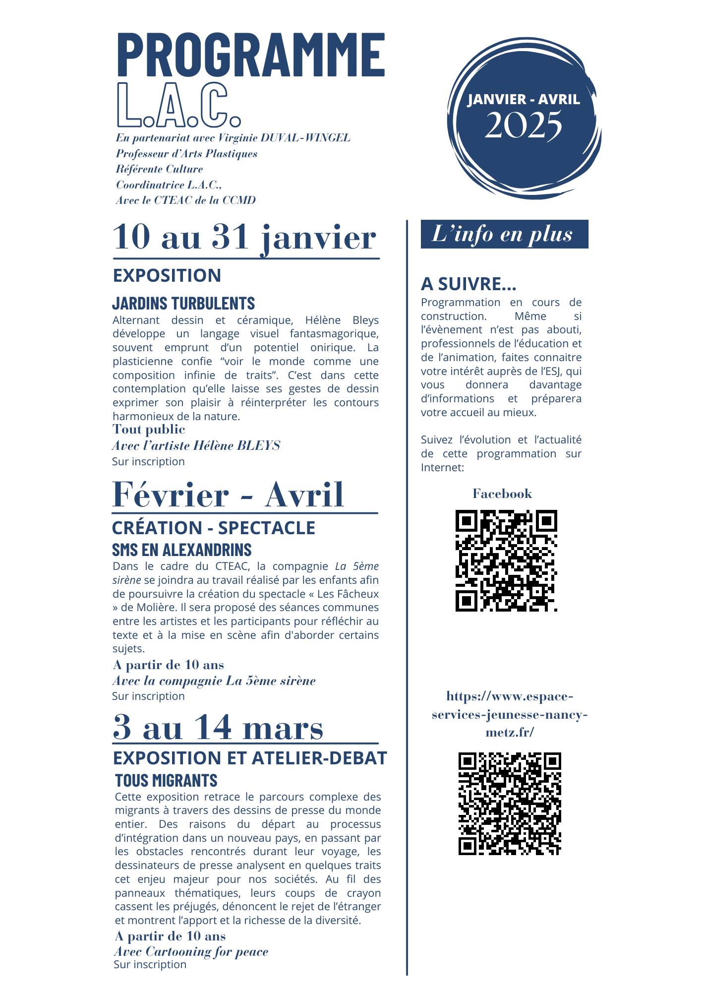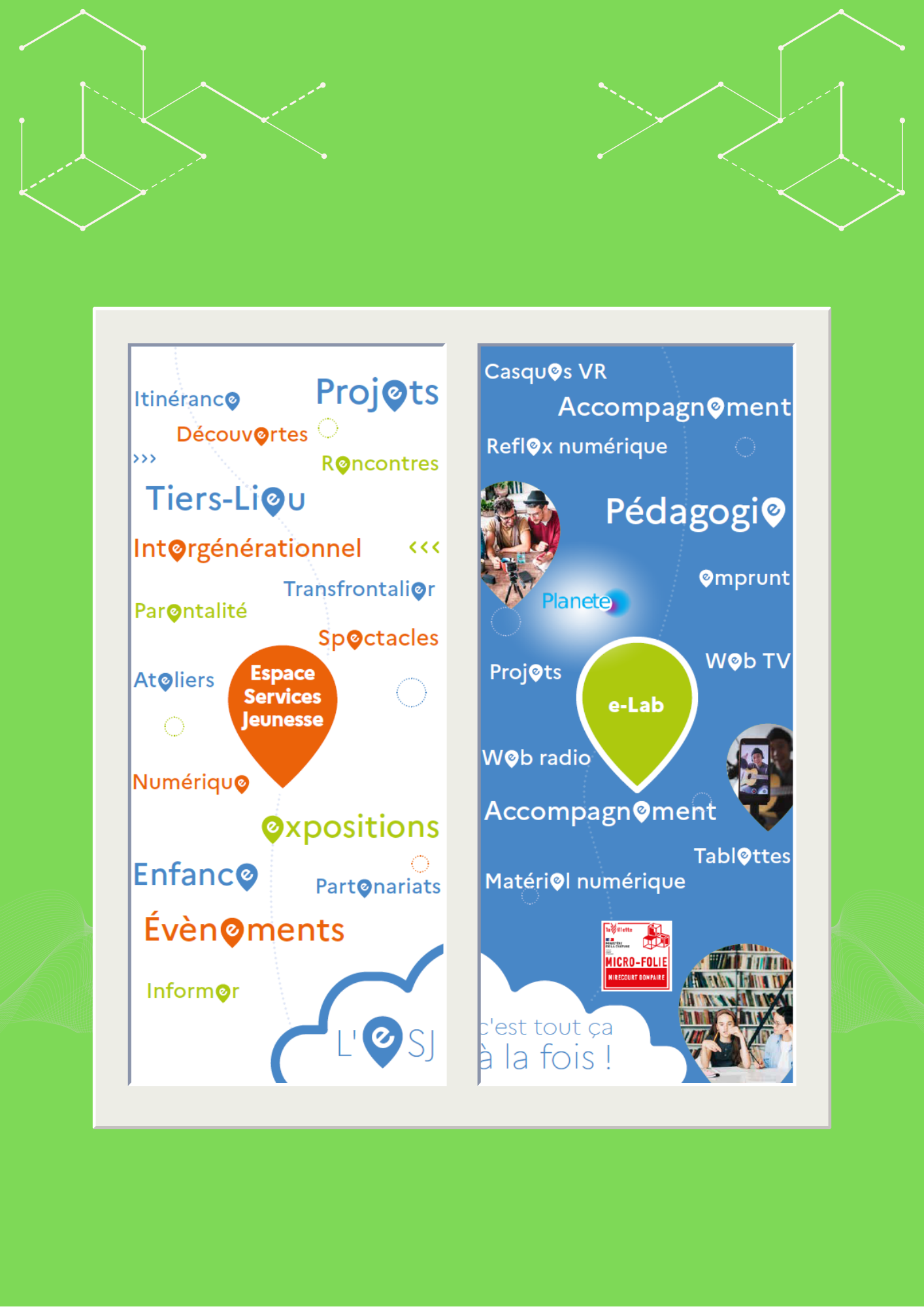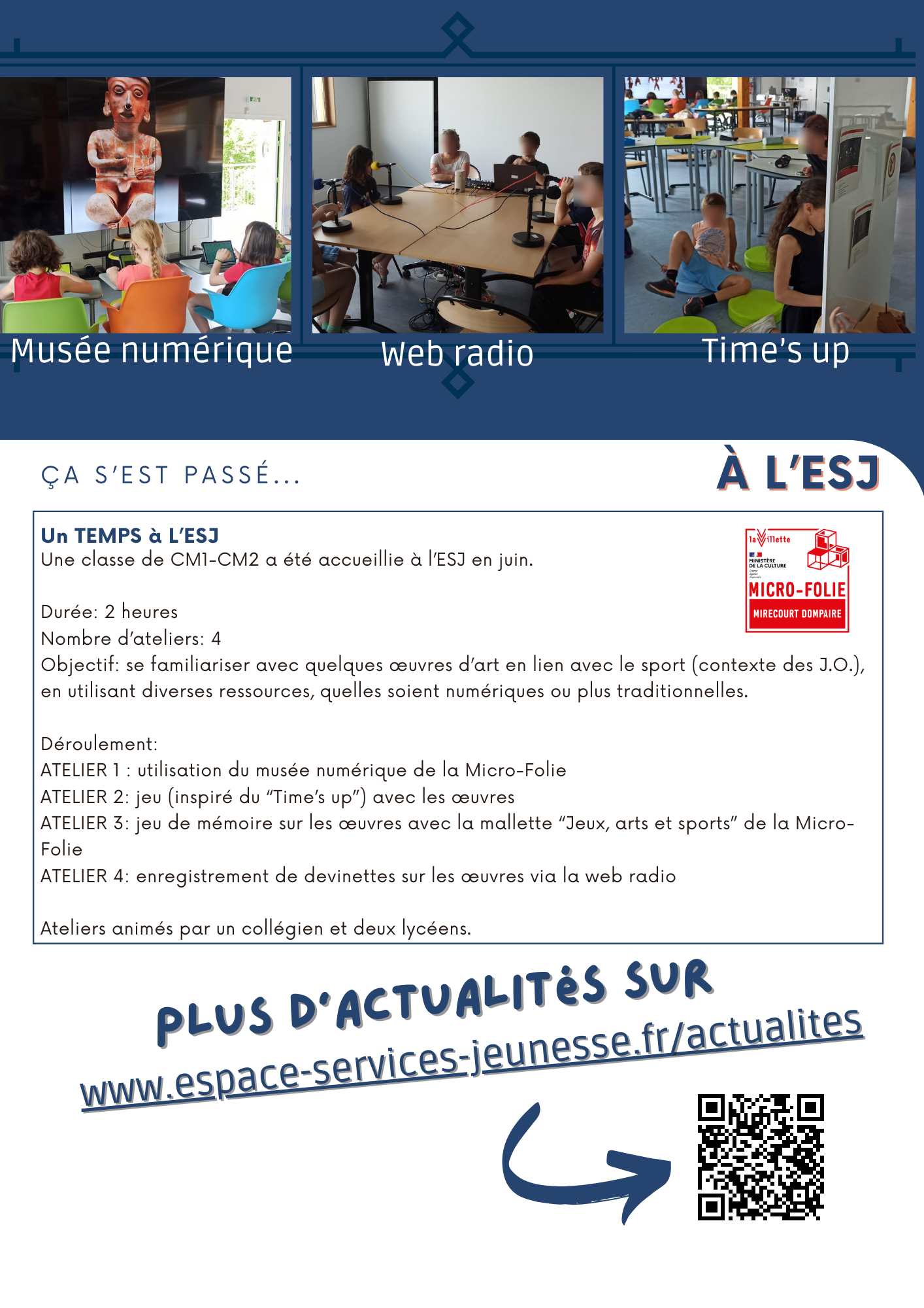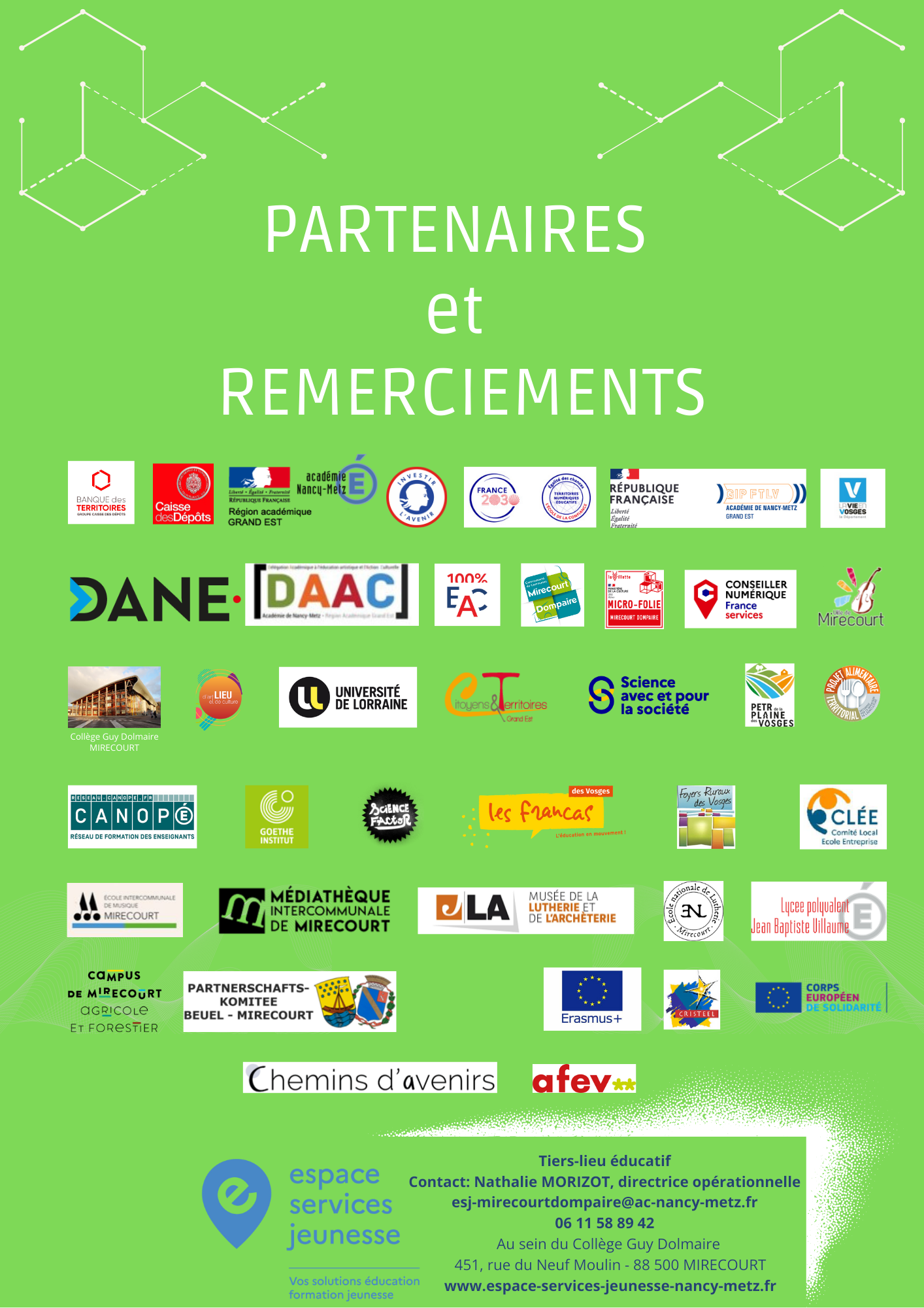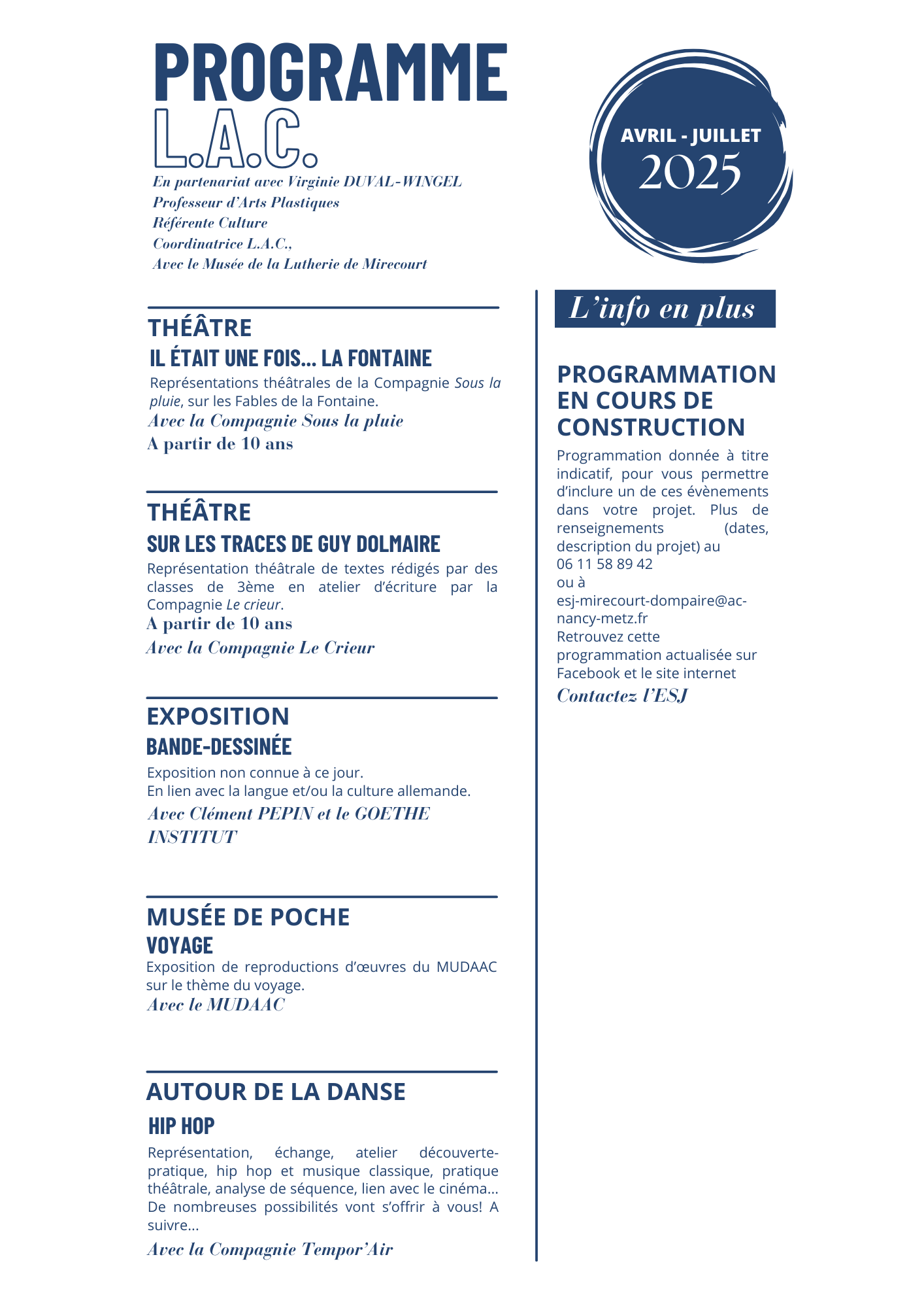 Retrouvez le programme RÉGULIÈREMENT ACTUALISÉ de l’ESJ du Territoire de Mirecourt Dompaire, avec des propositions autour des domaines traités par les tiers-lieux éducatifs (l’ESJ, le Laboratoire Numérique et le Lieu d’Art et de Culture – L.A.C.) du Collège de MIRECOURT: art, culture, numérique, orientation, …