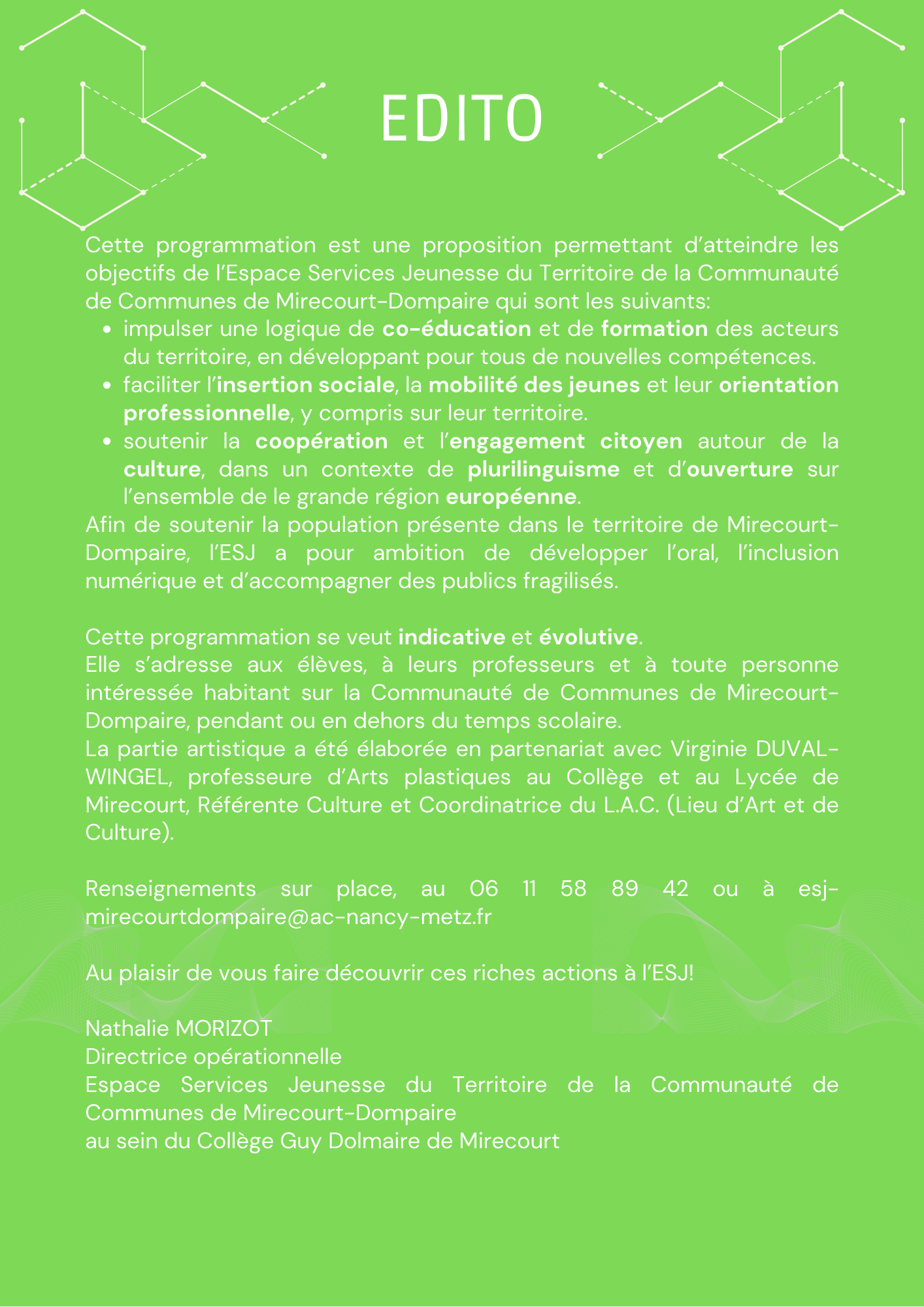 Renseignements sur place, au 06 11 58 89 42 ou à esj-mirecourtdompaire@ac-nancy-metz.fr